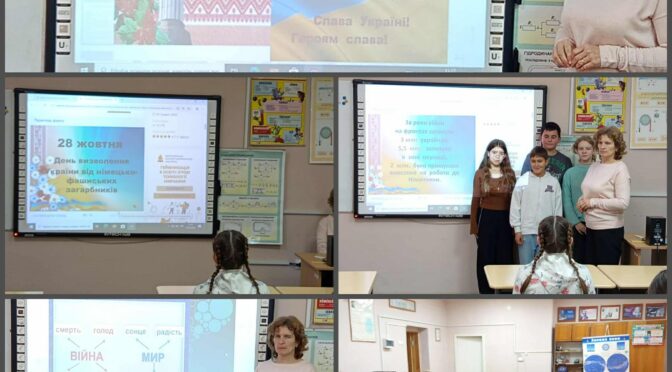 Педагоги-організатори підготували цікаву презентацію з фотографіями та архівними матеріалами. Вчителі історії наголосили на важливості памʼятати про тих, хто віддав життя за Батьківщину.
