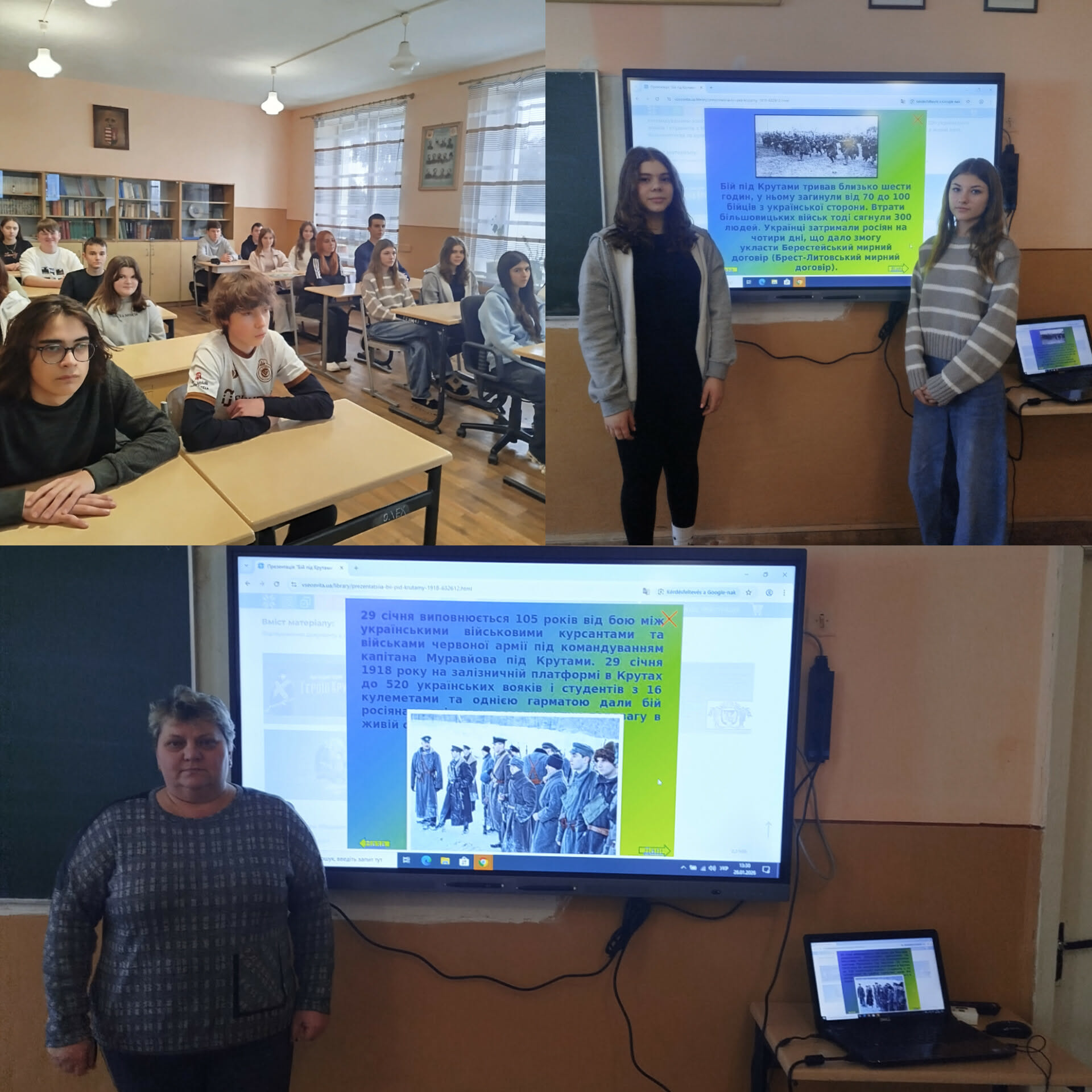 Учителі історії Чучка М. І. та Гайду С. С. провели для учнів початкових класів і 10 класу виховний захід у формі пізнавальної презентації. Під час заходу школярі ознайомилися з історичними подіями Бою під Крутами, його значенням для української державності та роллю молоді у боротьбі за свободу.