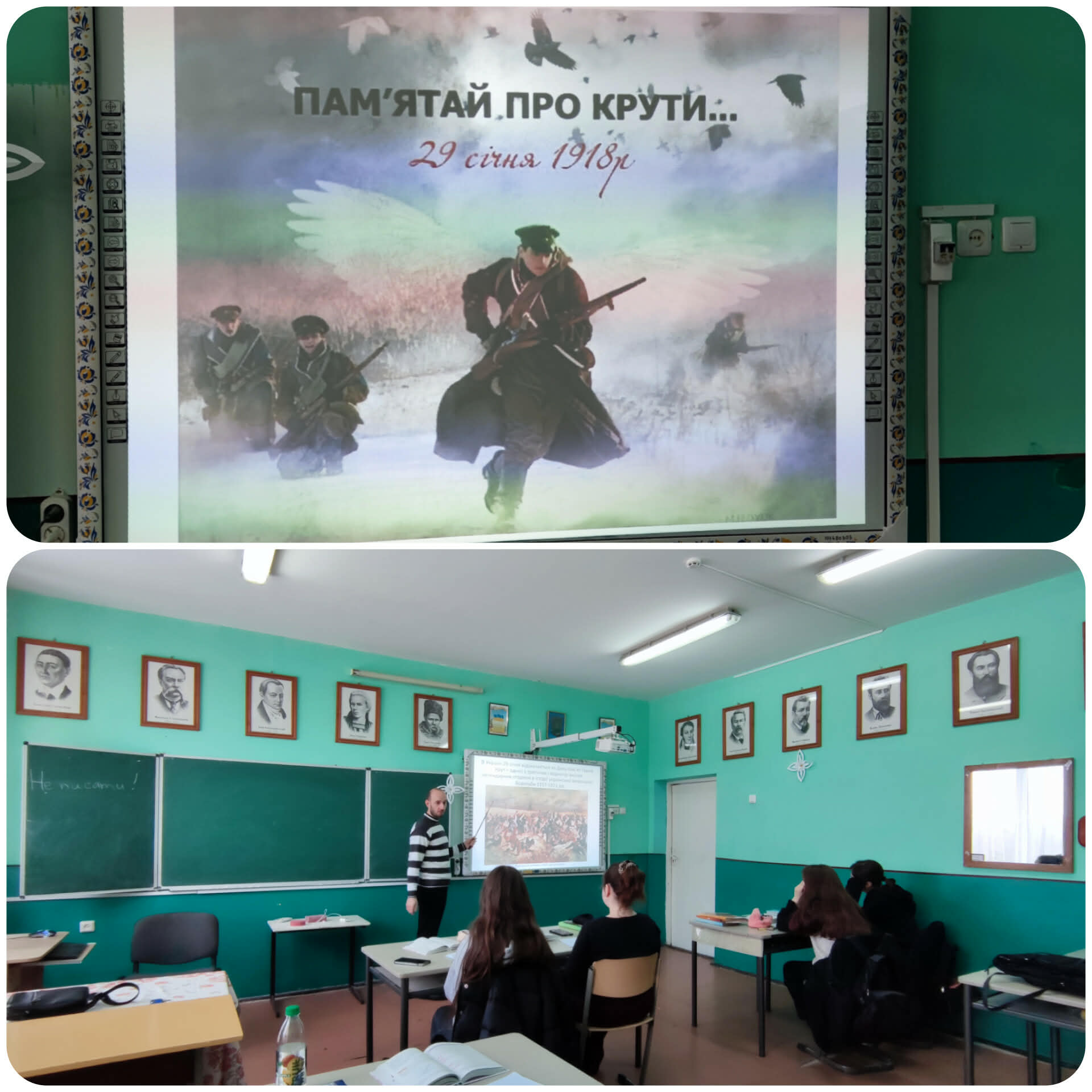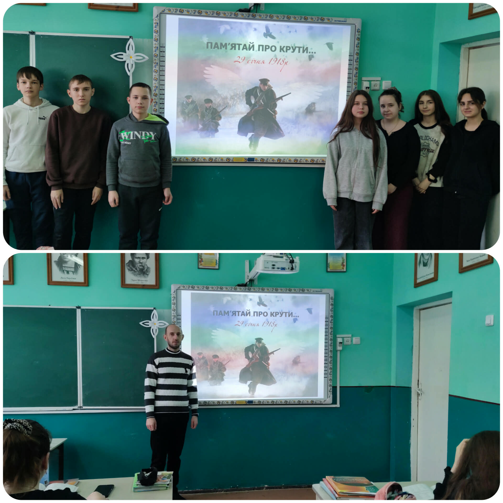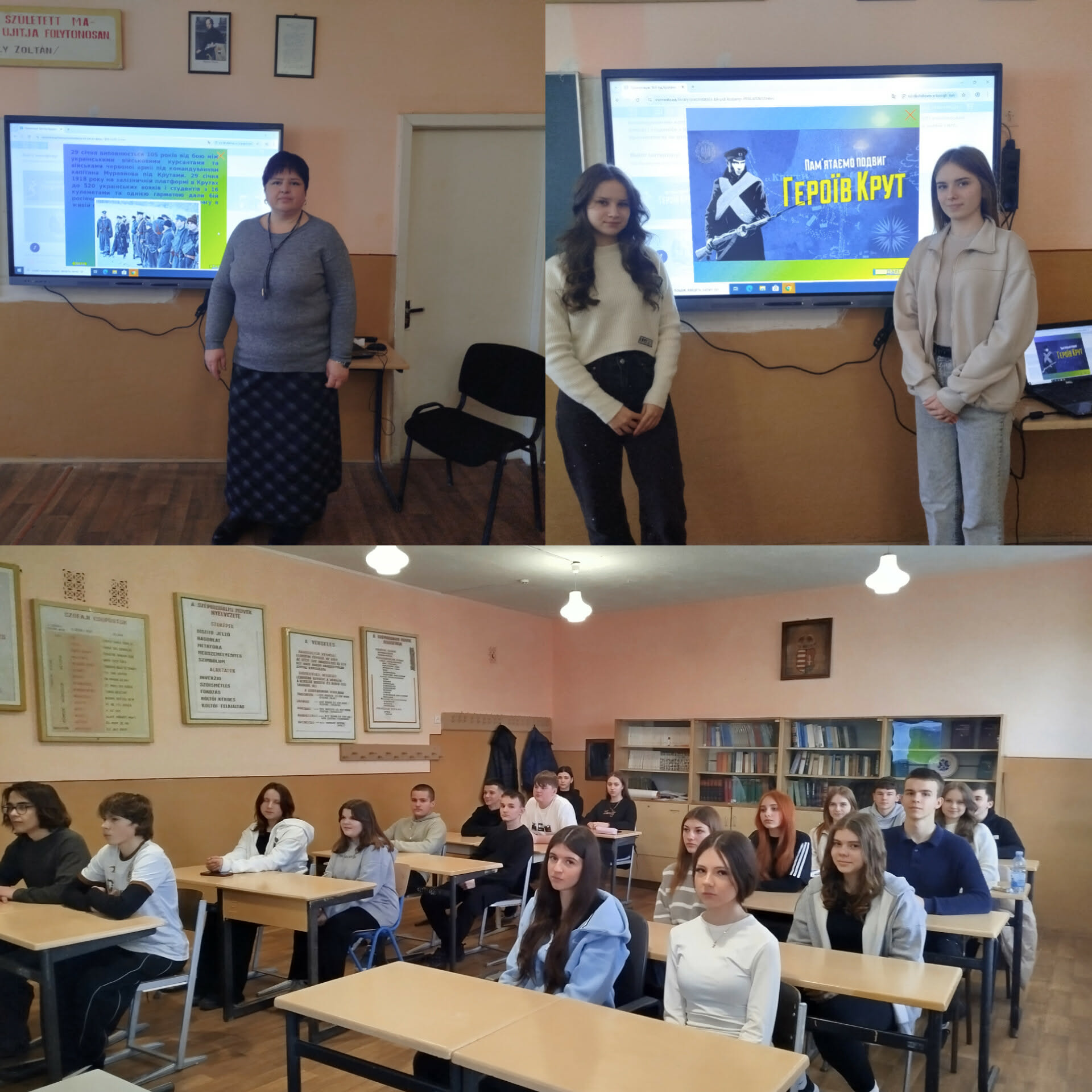 Учителі історії Чучка М. І. та Гайду С. С. провели для учнів початкових класів і 10 класу виховний захід у формі пізнавальної презентації. Під час заходу школярі ознайомилися з історичними подіями Бою під Крутами, його значенням для української державності та роллю молоді у боротьбі за свободу.