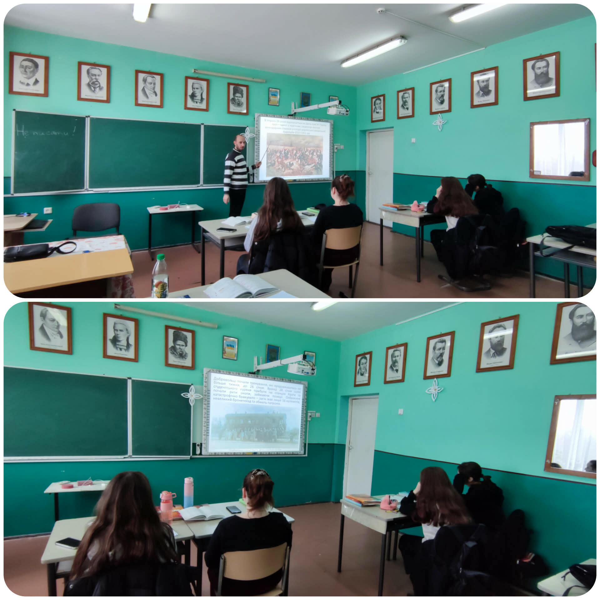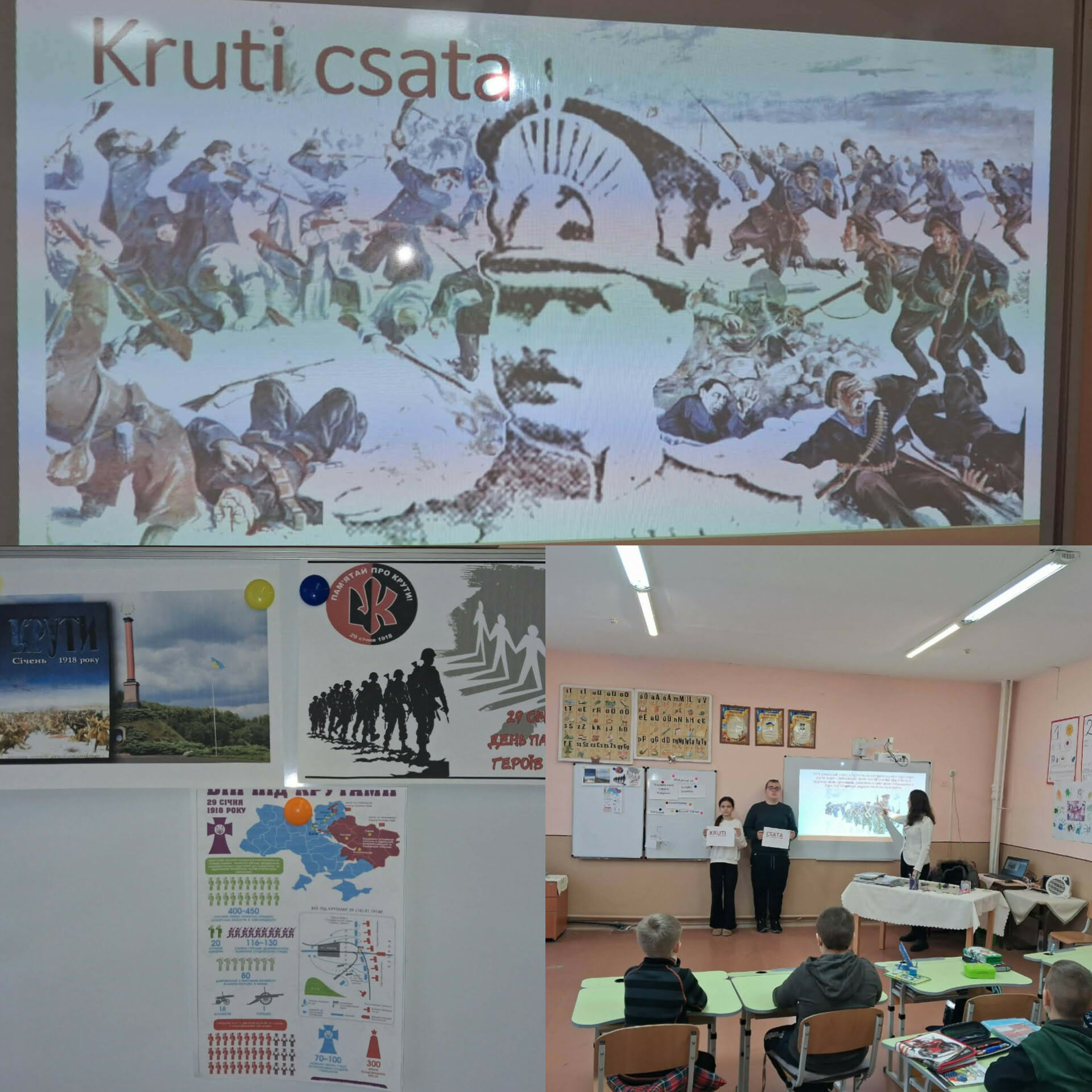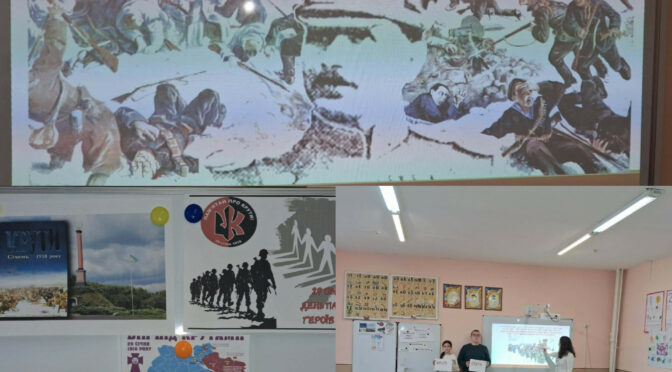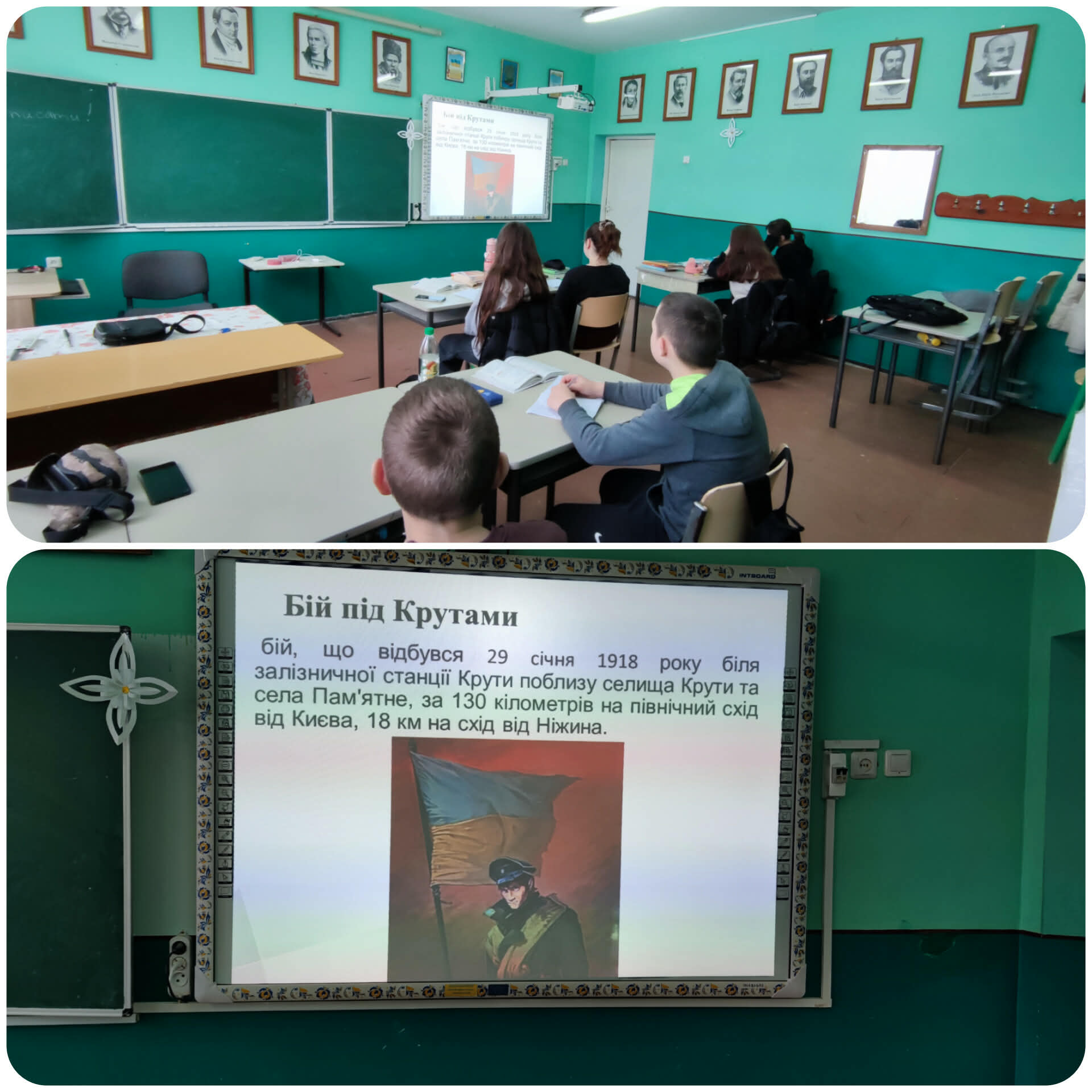 Учителі історії Чучка М. І. та Гайду С. С. провели для учнів початкових класів і 10 класу виховний захід у формі пізнавальної презентації. Під час заходу школярі ознайомилися з історичними подіями Бою під Крутами, його значенням для української державності та роллю молоді у боротьбі за свободу.