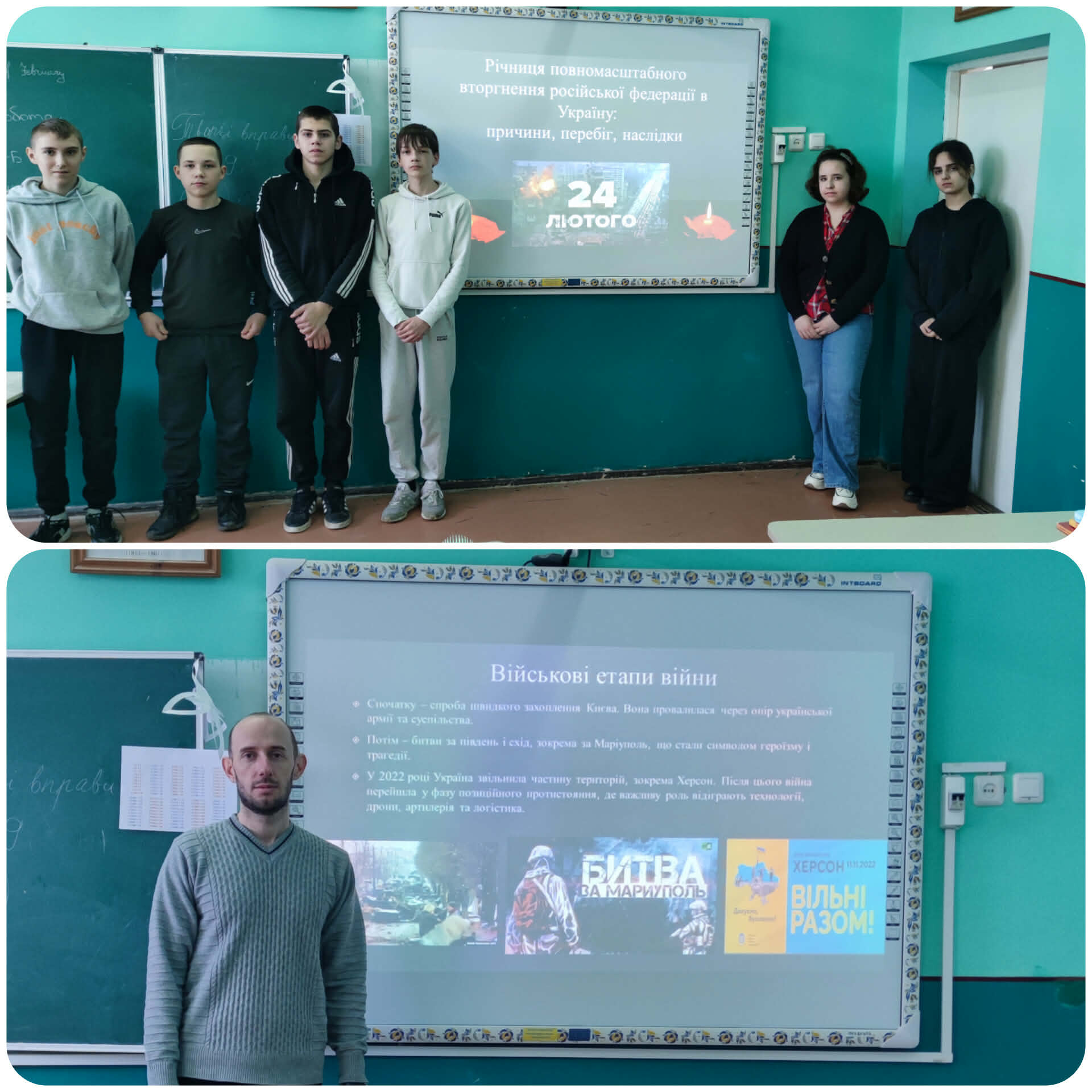 Ми віримо, що настане день Миру. Ми пам’ятаємо тих, хто віддав життя за Україну. Ми продовжуємо жити, навчатися й мріяти заради майбутнього нашої країни. Педагоги ліцею проводили з учнями1-11 класів різні заходи повʼязані з річницею війни: інтерактивні презентації з елементами вікторини, виставку малюнків, створення дошки пам’яті. Вчителька історії з учнями до Дня пам’яті 24 лютого провела патріотичну акцію пам’яті та єдності.